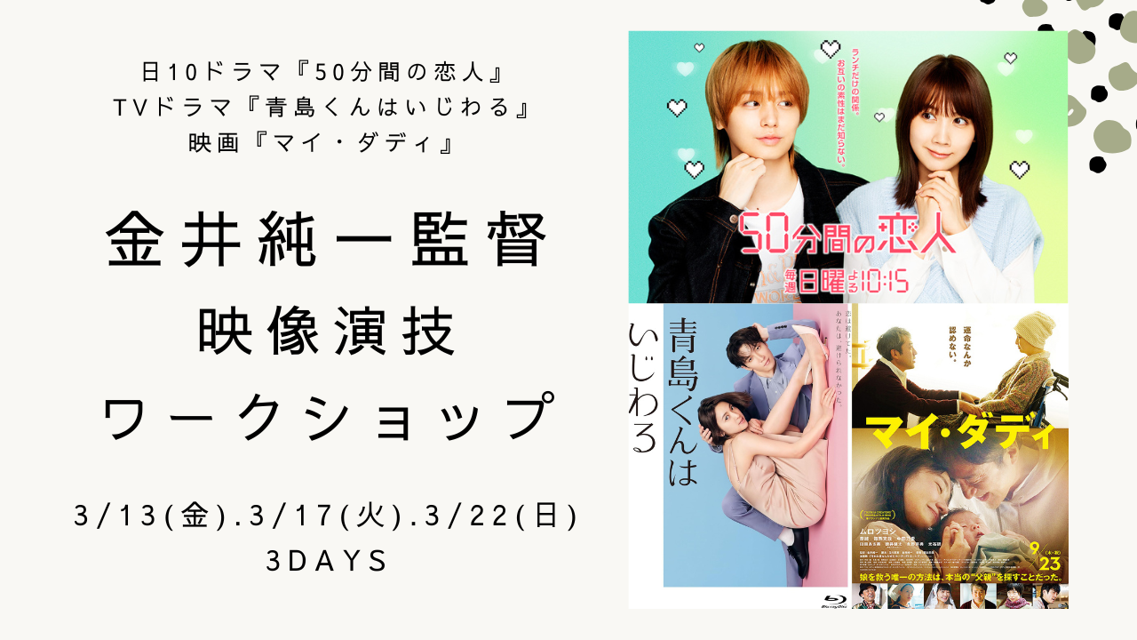 3月は、TVドラマ『青島くんはいじわる』(渡辺翔太・中村アン)、映画『マイ・ダディ』(ムロツヨシ・奈緒ほか)監督の金井純一さんをお招きして映像演技ワークショプを開催いたします!